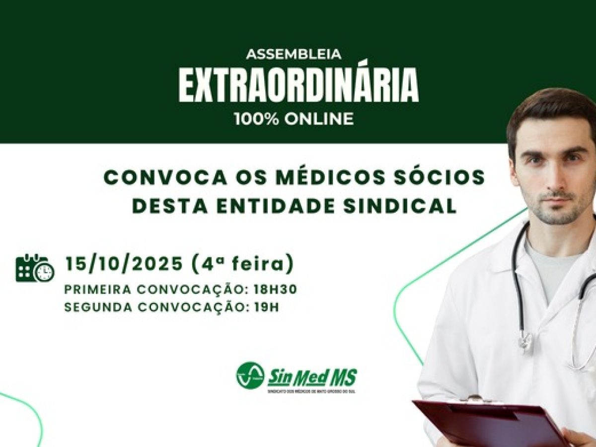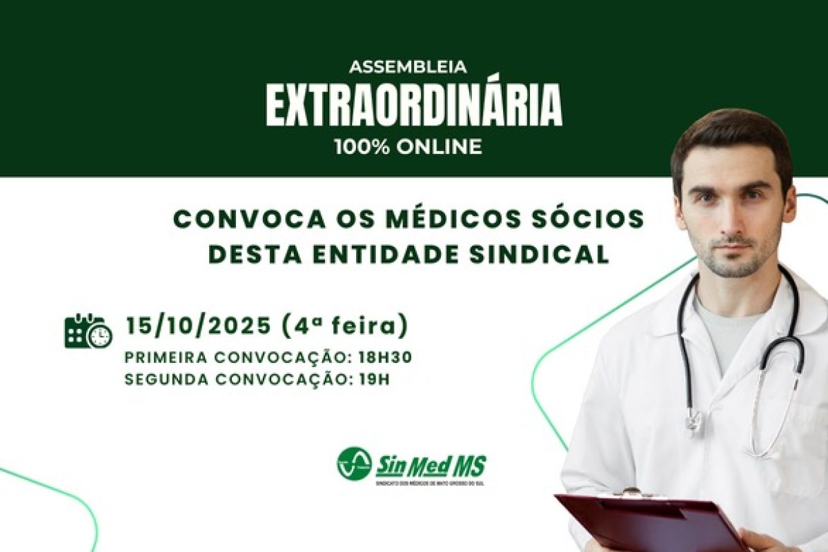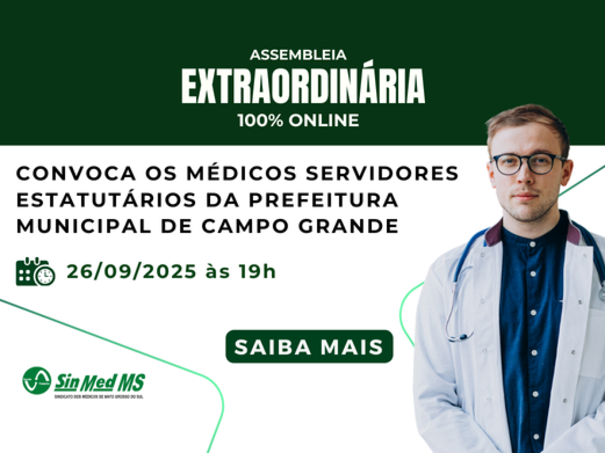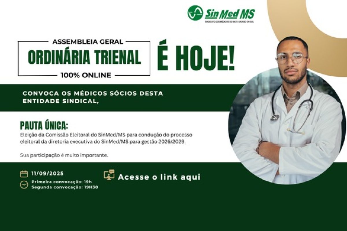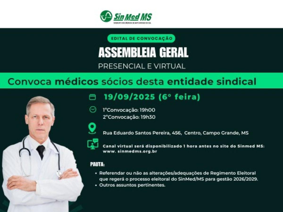 O Sindicato dos Médicos de Mato Grosso do Sul (SinMed/MS) realiza nesta quinta-feira, 11 de setembro de 2025, a Assembleia Ge...