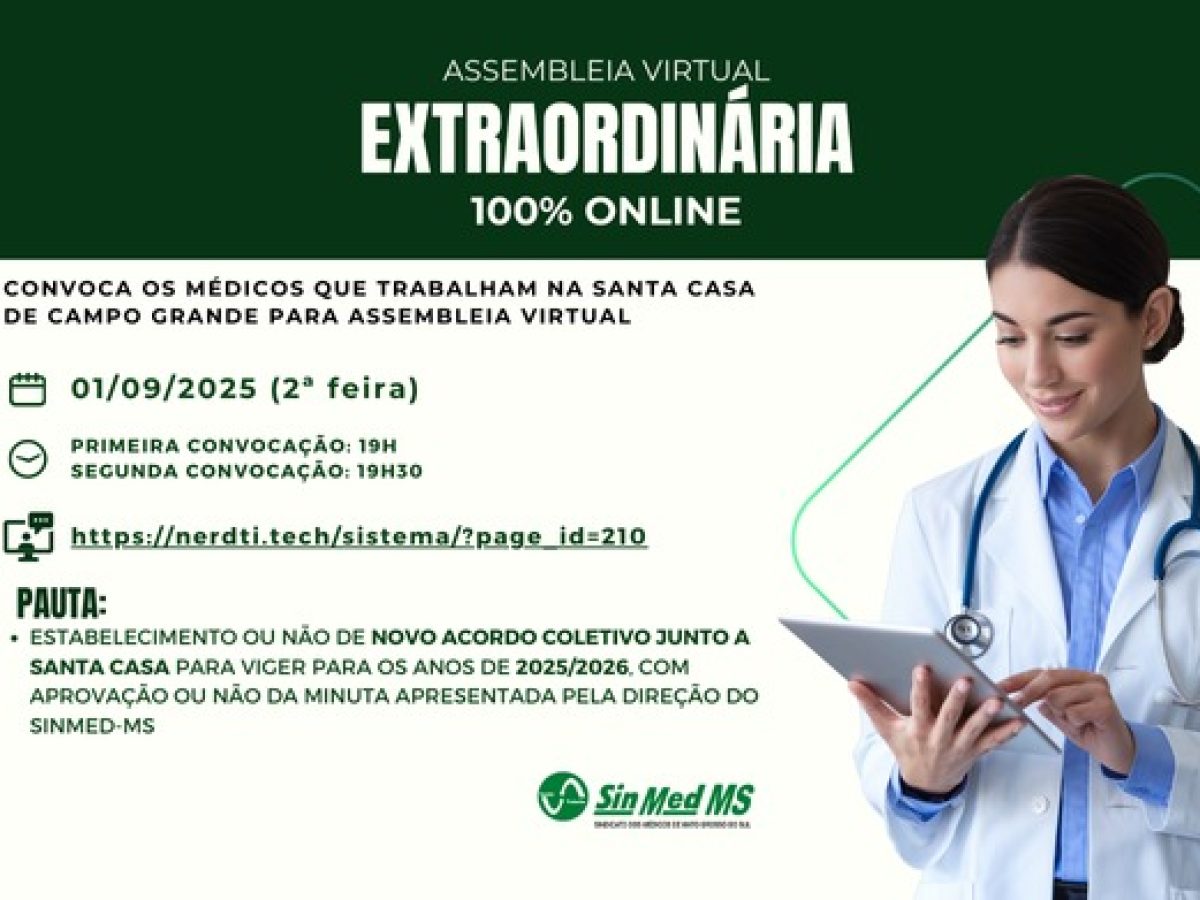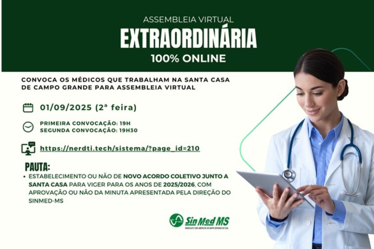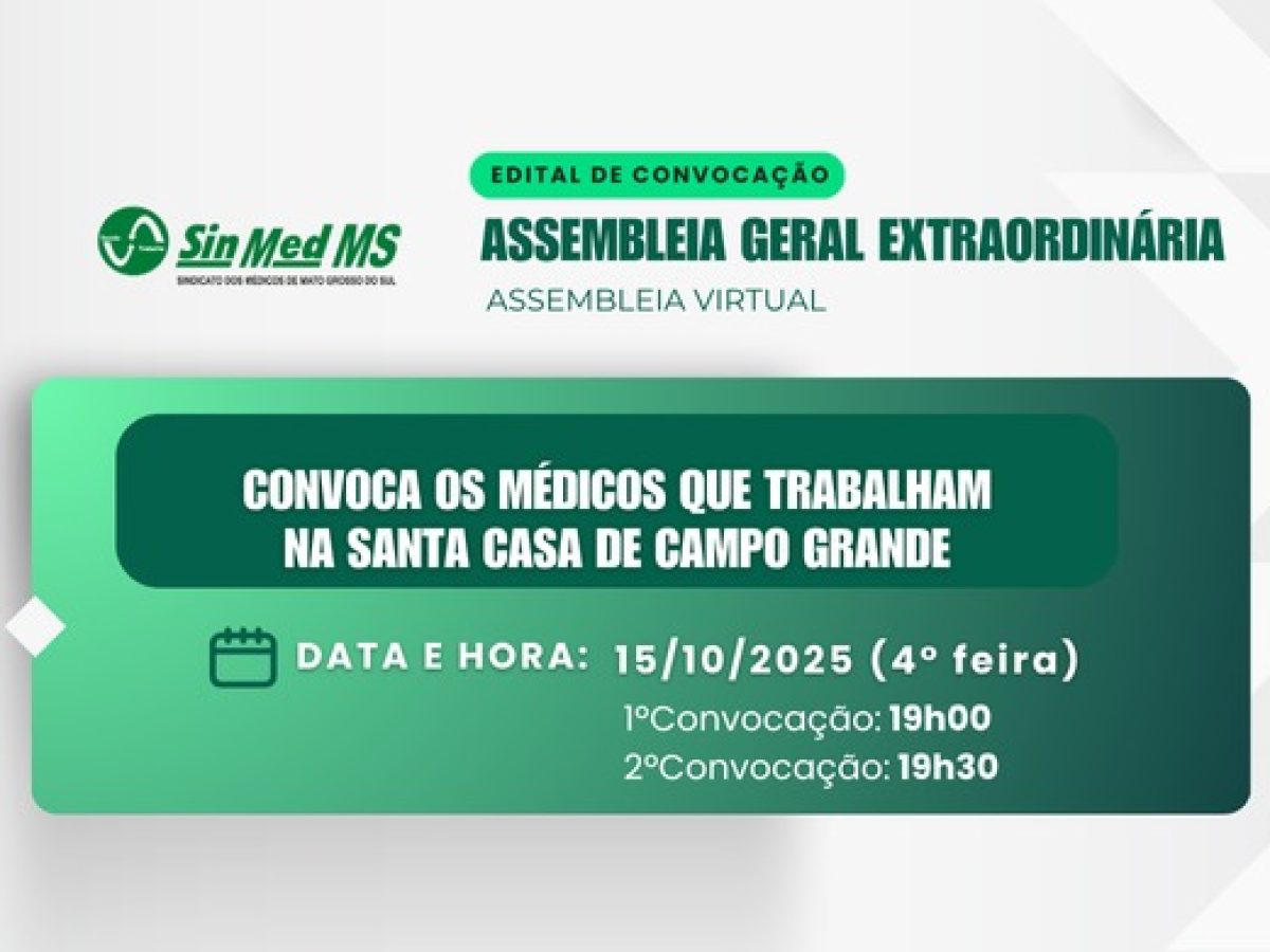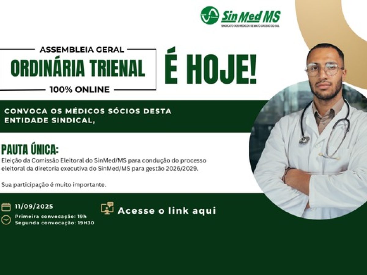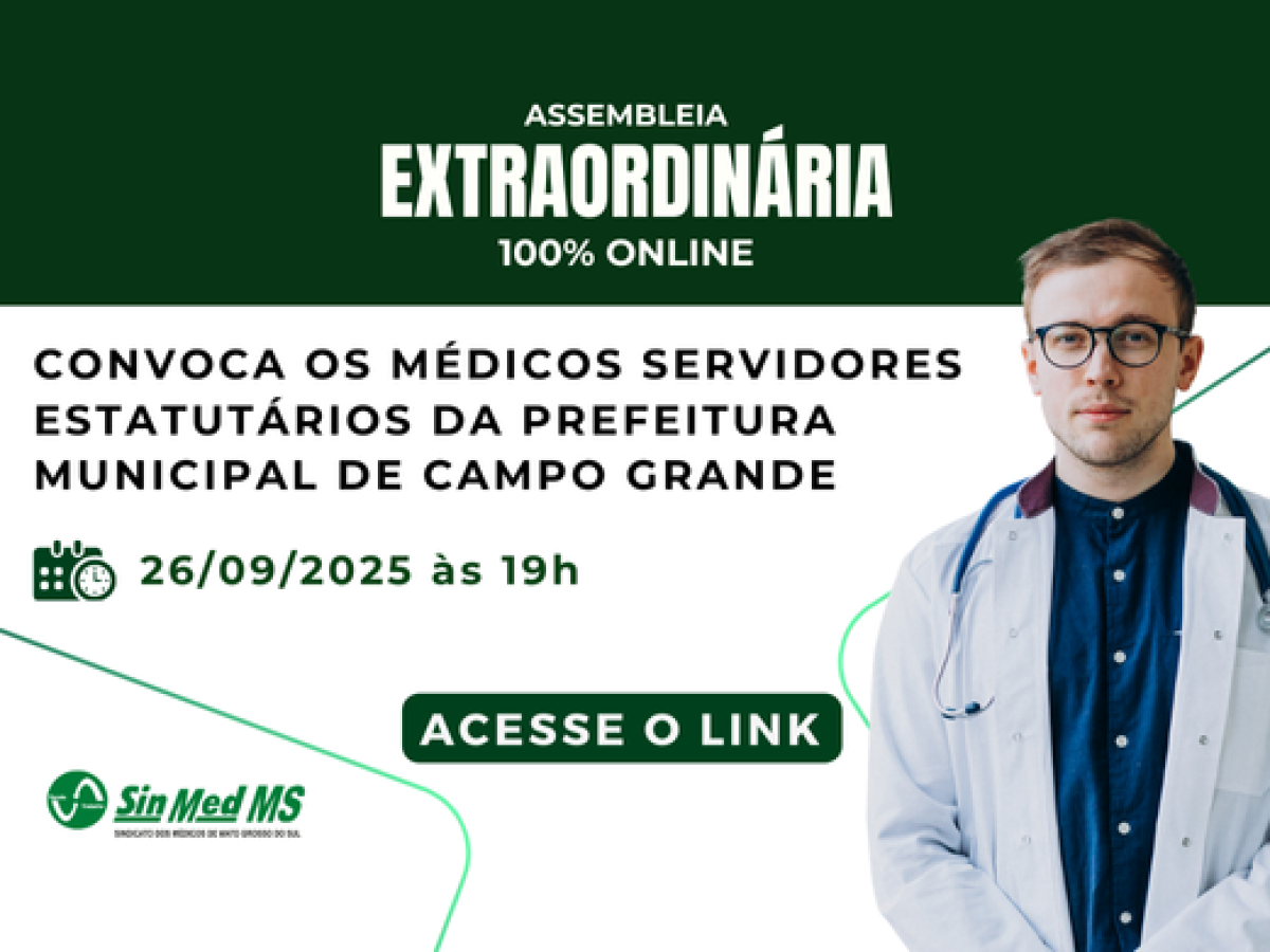 O Sindicato dos Médicos de Mato Grosso do Sul (SinMed/MS) realiza nesta quinta-feira, 11 de setembro de 2025, a Assembleia Ge...